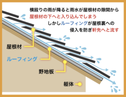 一般的な屋根材にはどうしても隙間が生じます。そのため、台風などの一定以上の強風雨を受けると、その隙間から浸水してしまいます。ルーフィングはその侵入した水を外に流す機能を持っています。屋根材とルーフィングの両方があってこそ、お家を水から守れることができるのです。