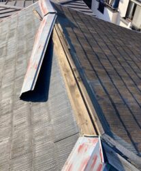 p様:雨漏り箇所をコーキングで埋めたが、雨でまだ漏れていた →再度上って点検。コーキングが割れていた。
