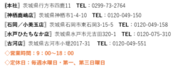 神栖鹿嶋店(神栖市)・石岡/小美玉店(石岡市)・水戸ひたちなか店(水戸市)・古河店(古河市)にございます。