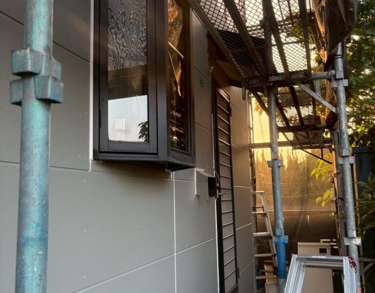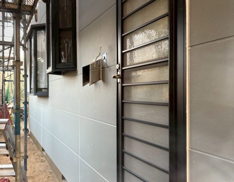 | 一面外壁貼替工事 | 既存外壁解体工事(胴縁下地材込み)/新規透湿防水シート工事/新規下地胴縁材工事(15mm)/新規外壁コーナ工事(同質出隅3030)/新規外壁貼り工事/新規外壁コーキング工事 |