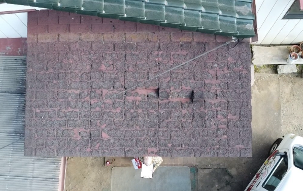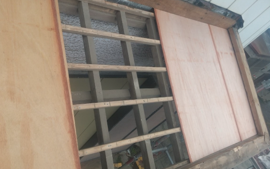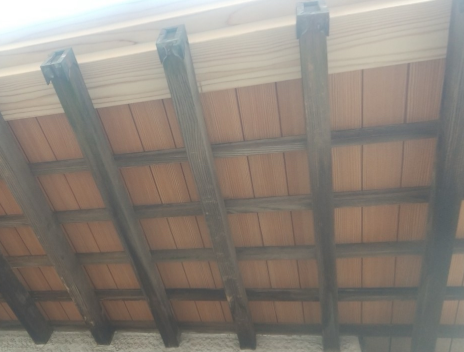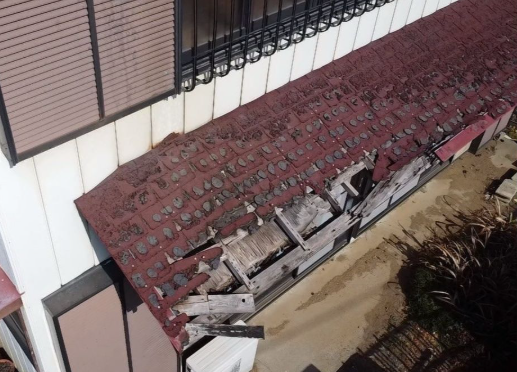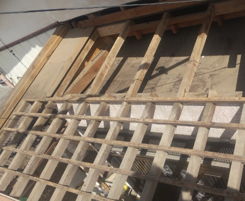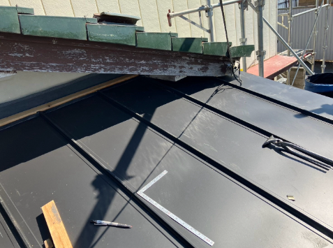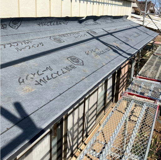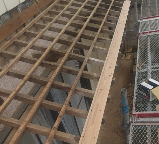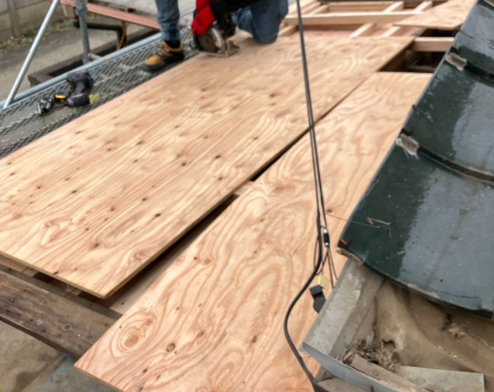 | 屋根工事 | 既存屋根材取り外し、既存下地材取り外し(ザラ板及び垂木及び軒天材)、処分、下地補修及び腐食木部補修、下地ラーチ合板工事、ルーフィング工事、本体工事、軒周り及びケラバ周り工事、雨押え板金工事(樹脂貫使用) |