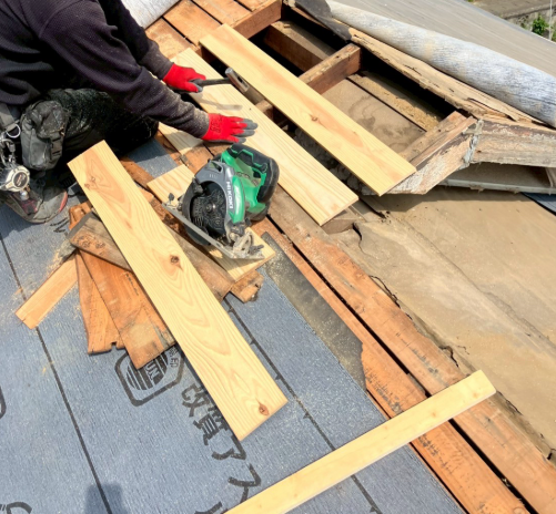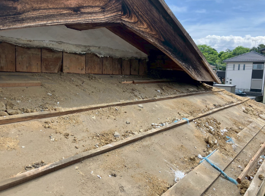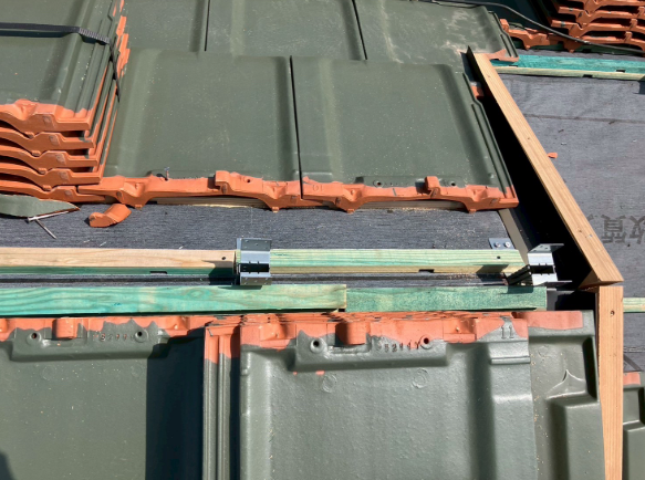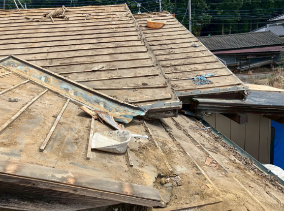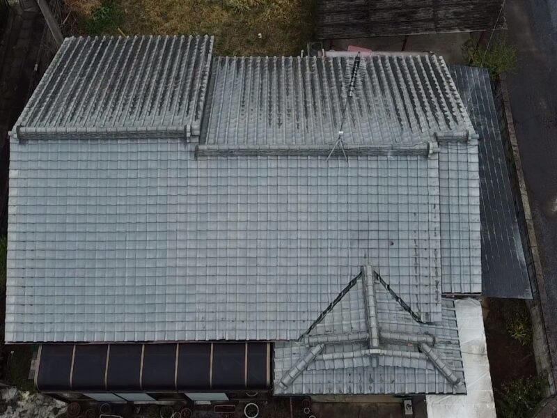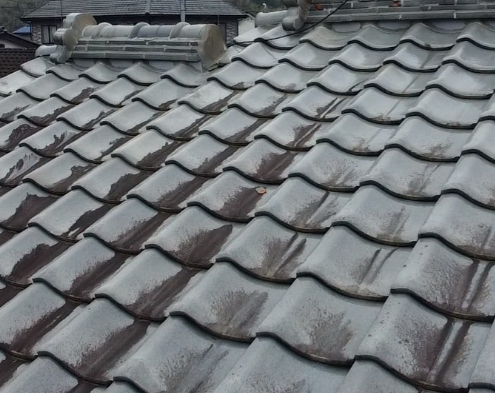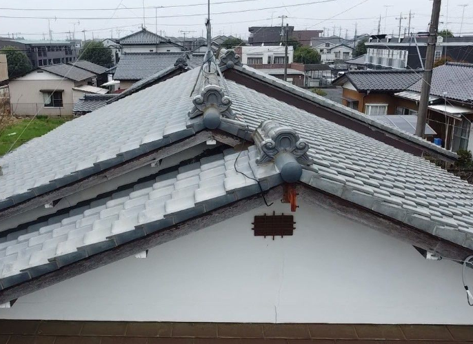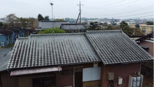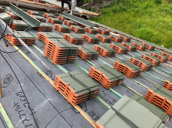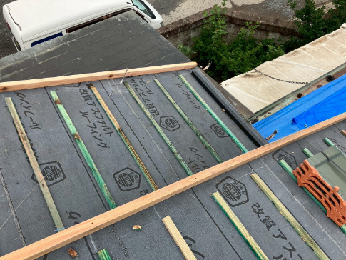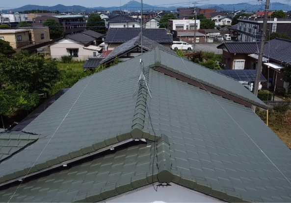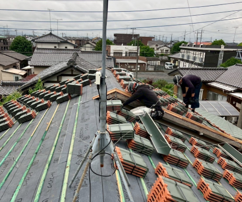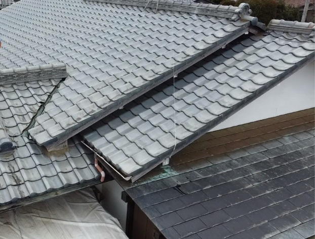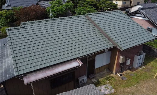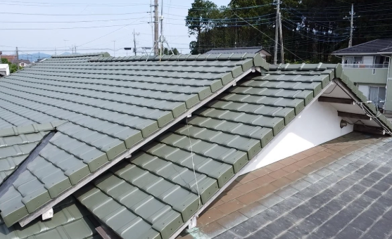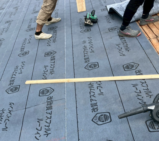 | 屋根工事 | 足場工事、荷上げ機設置工事、既存瓦取り外し及び掃除/処分、ルーフィング工事、瓦桟工事(水切り付きタイプ)、本体工事(全釘工法)、軒周り/垂木/軒メンド、ケラバ周り、ケラバ水切り、三角棟工事(ガイドライン工法)65㎜ステンレスビス、本谷板金工事/ガルバリウム鋼板ブラック、捨谷工事・雨押え工事(ガルバリウム鋼板)、引丸部 なんばん工法、箕甲部 平板板金工事 |